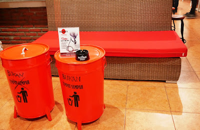 ada bangku rotan dengan bantalan merah unik yang bisa digunakan untuk duduk santai,
